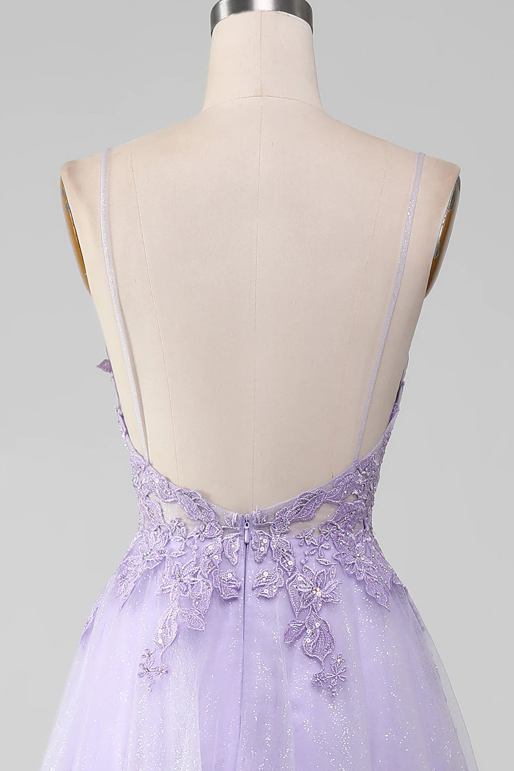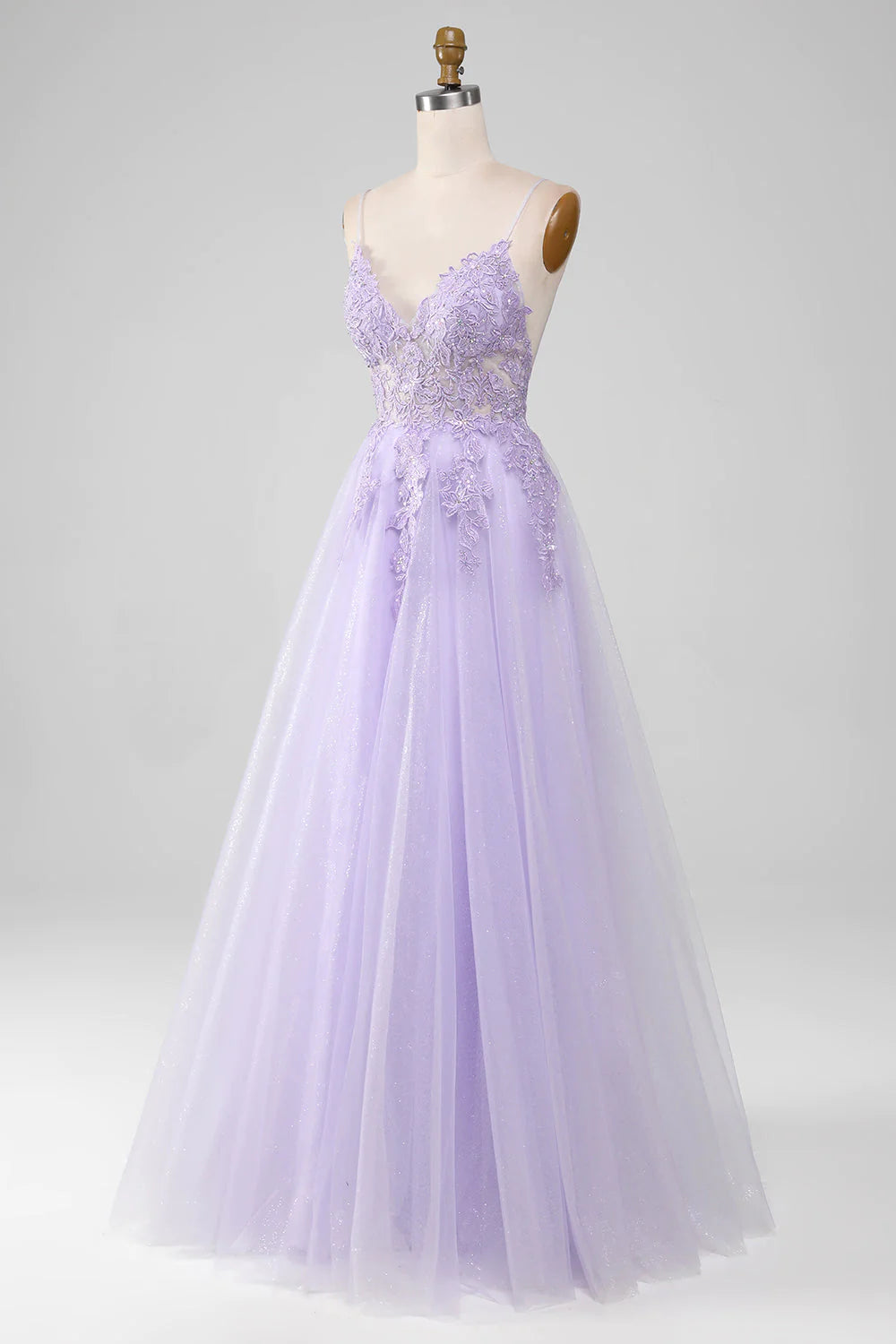 Glitzerndes, hellviolettes, langes A-Linien-Ballkleid mit Spaghettiträgern und Perlenbesatz