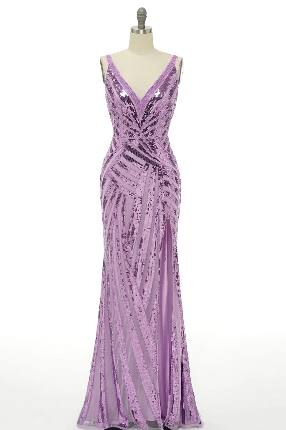 Rückenfreies, langes Ballkleid mit glitzernden lila Pailletten