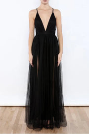 Tüll Sexy V-Ausschnitt Seitenschlitz Abendkleider Ballkleid - US 2 / UK 6 / EU 32