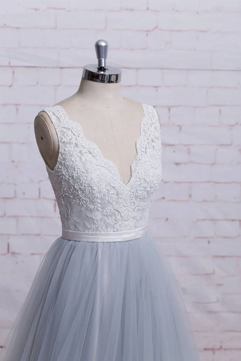 Langes Ballkleid aus Spitzentüll mit V-Ausschnitt