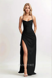 FannyWe Elegantes, schlichtes, schwarzes, gerüschtes, langes Abendkleid mit Spaghettiträgern und Schlitz - US 2 / UK 6 / EU 32