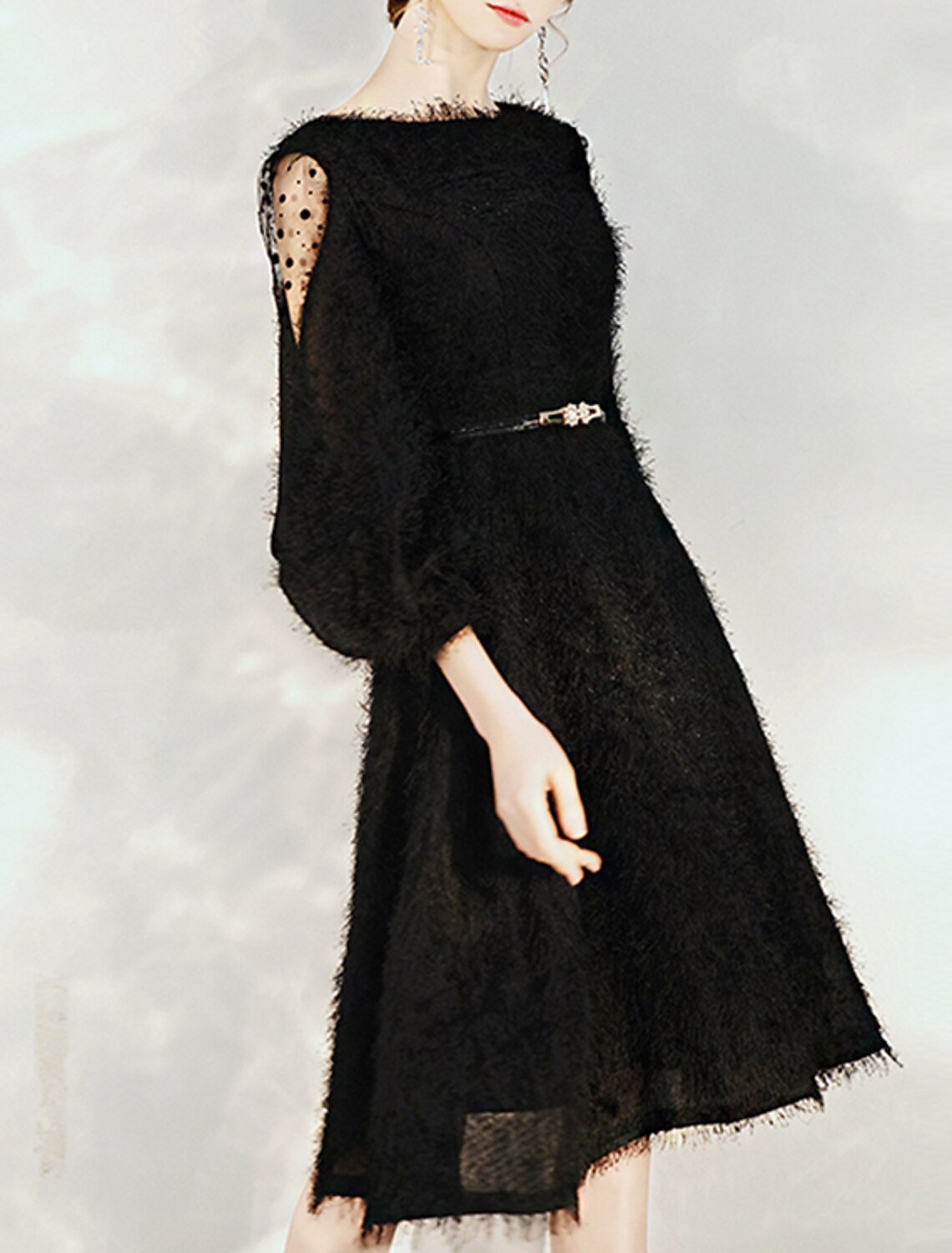 Vestido de cóctel de corte A, estilo princesa, largo hasta la rodilla, manga 3/4, cuello joya, nailon con faja/cinta, color puro.