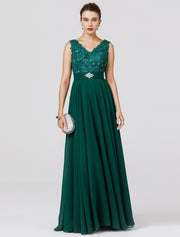 Vestido elegante de corte A para invitada de boda, formal, de noche, largo hasta el suelo, sin mangas, cuello en V, de gasa, espalda en V con faja/cinta y abalorios
