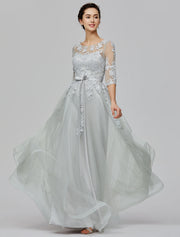 Vestido estilo imperio de corte A para invitada de boda, largo hasta el suelo, media manga, cuello ilusión, tul con apliques de lazo(s).