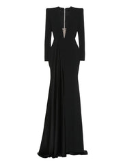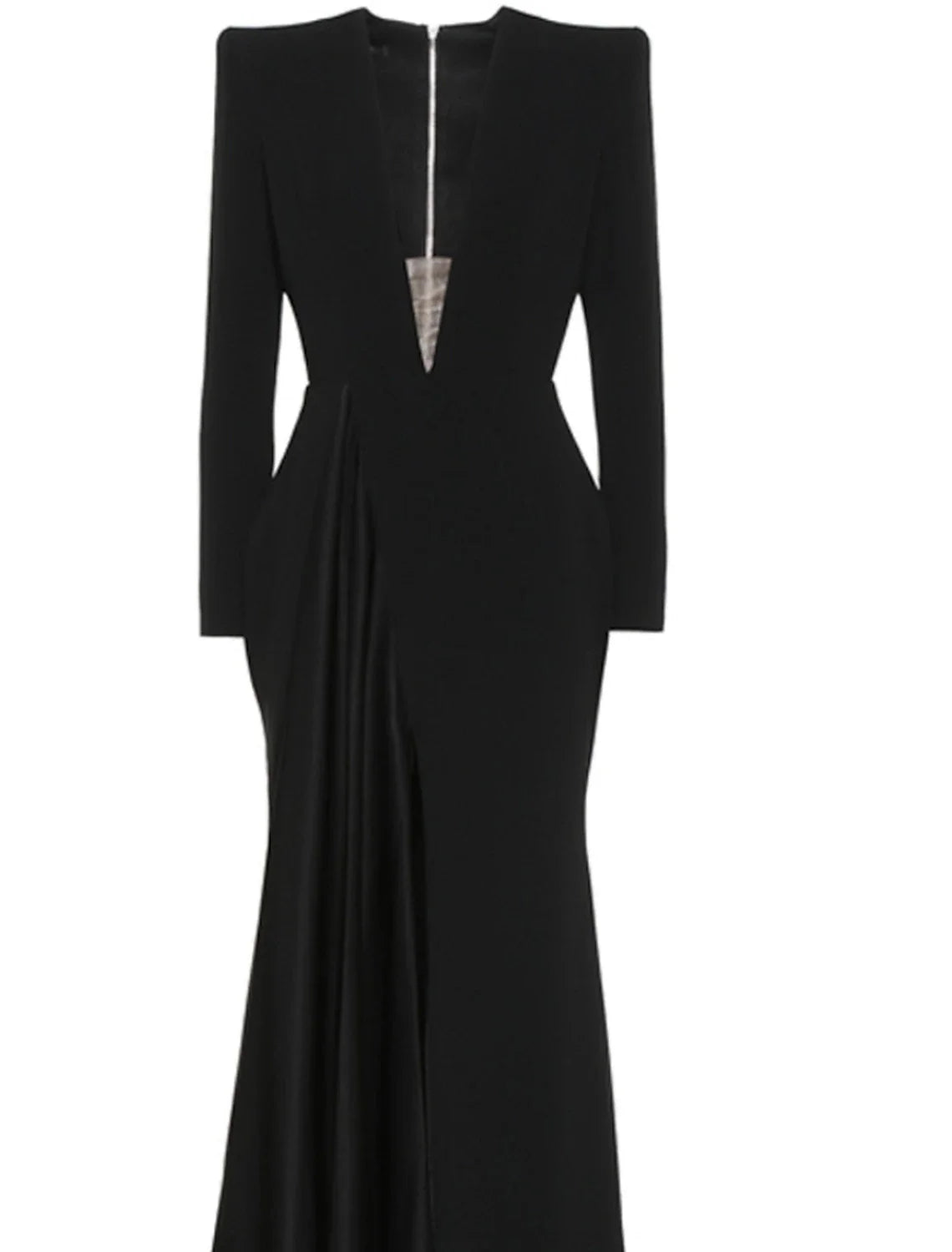 Vestido de noche elegante de corte A, color negro champán, talla grande, formal, con cola larga, escote en V, tejido elástico con pliegues y abertura.