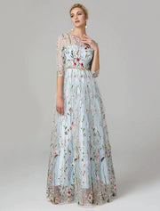 Vestido de noche elegante de corte A, largo hasta el suelo, manga de encaje con bordado