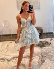 Vestido de fiesta corto con hombros descubiertos, con purpurina y capas para el regreso a casa - Gris / EE. UU. 2 / Reino Unido 6 / UE 32