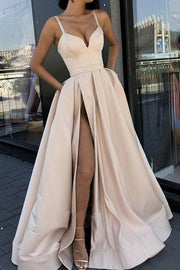 Vestido de fiesta de satén con escote en V, tirantes finos, abertura alta, bolsillos y corte A