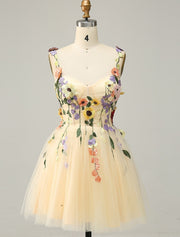 Vestido de fiesta de bienvenida de corte A, floral, para cóctel, corto/mini, sin mangas, con tirantes finos, de tul y apliques