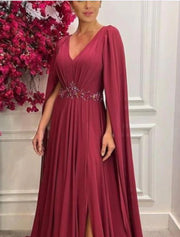 Vestido de madre de la novia de corte A, formal, para invitada de boda, elegante, escote en V, cola larga/cortada, de gasa, sin mangas, con pliegues, abertura frontal, broche de cristal