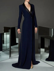 Vestido de Madre de la Novia de Corte A para Invitadas de Boda, Elegante Escote en V, Cola Larga, Tejido Elástico, Manga Larga con Abertura Delantera, Color Sólido