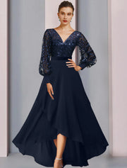 Vestido de madre de la novia de corte A para invitada de boda Brillo y brillo Escote joya alto bajo Asimétrico Largo hasta la rodilla Gasa Encaje Lentejuelas Manga larga con apliques de lentejuelas Otoño