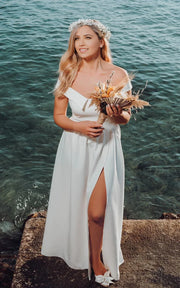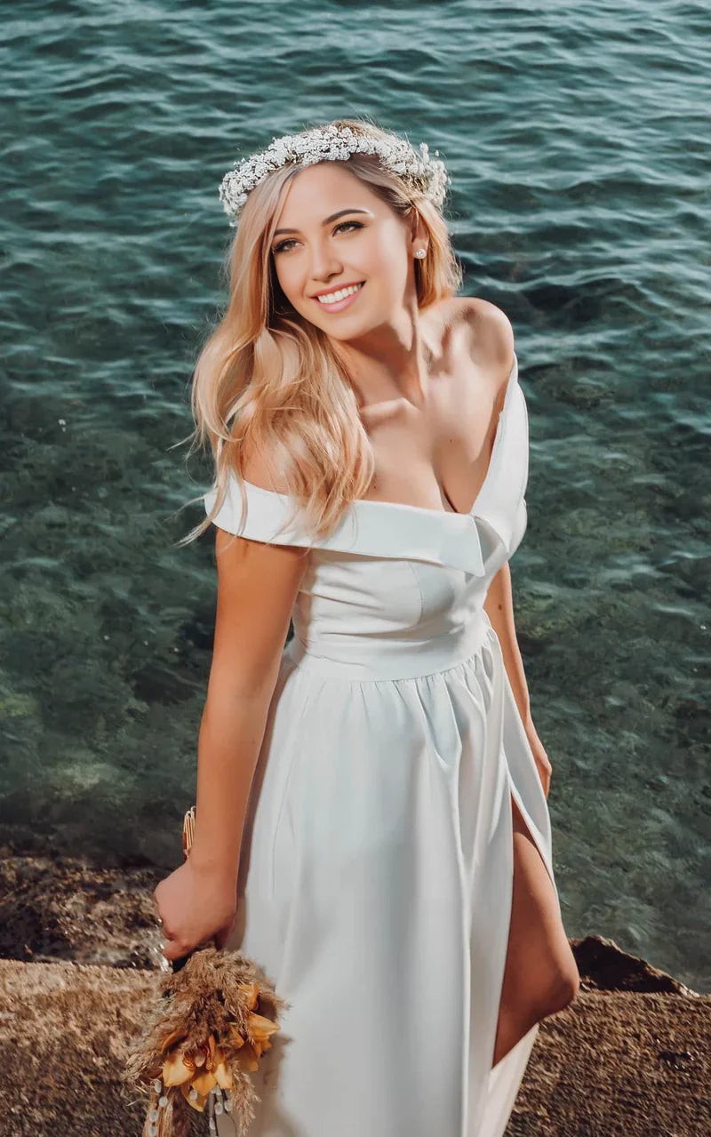 Vestido de novia de satén con hombros descubiertos, corte A, sin mangas y abertura frontal