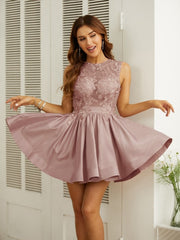 Vestidos cortos/mini de corte A/princesa con encaje charmeuse, sin mangas y escote redondo