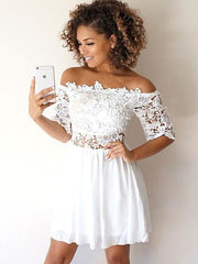 Vestidos cortos/mini de gasa con apliques, hombros descubiertos y mangas 1/2, corte princesa/corte A