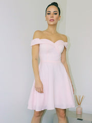 Vestidos de fiesta cortos/mini de gasa sin mangas, corte A/princesa, hombros descubiertos