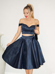 Vestido de dos piezas de satén, corte princesa, hombros descubiertos, volantes, sin mangas, largo hasta la rodilla