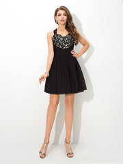 Vestidos de cóctel cortos de gasa sin mangas con encaje y tirantes princesa en forma de A