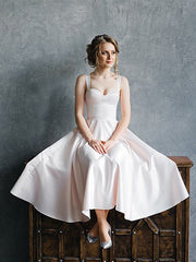 Vestidos de novia de corte A/princesa con tirantes, satén, volantes, sin mangas y largo hasta la rodilla