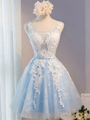 Vestidos de fiesta cortos/mini de corte A/princesa con apliques de tul y escote redondo sin mangas