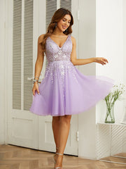 Vestidos de corte A/princesa de tul con cuentas, escote en V, sin mangas y hasta la rodilla