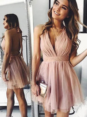 Vestidos de fiesta cortos/mini de corte A/princesa, de tul fruncido, con cuello halter, sin mangas