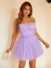 Vestidos cortos/mini de corte A/princesa con volantes de tul, sin tirantes y sin mangas
