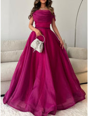 Vestidos de fiesta de corte A, elegantes, formales, con cola larga y mangas cortas, hombros descubiertos, tul con pliegues y fruncido.
