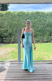 Vestidos largos formales de satén azul con tirantes en forma de A para dama de honor, vestido de noche, vestido de fiesta