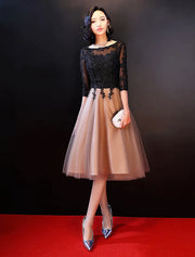 Vestido de novia corte A, escote barco, espalda descubierta, media manga, largo hasta la rodilla, apliques de encaje