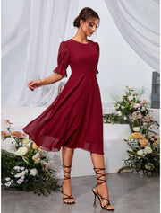 Vestido elegante de fiesta para invitada de boda, corte A, largo hasta la rodilla, media manga, cuello joya, gasa con flecos
