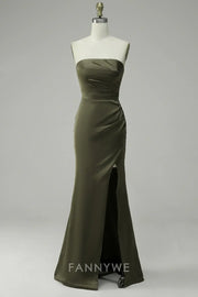 Elegante vestido de satén sin tirantes FannyWe: detalles fruncidos y diseño de abertura alta. Vestidos formales.