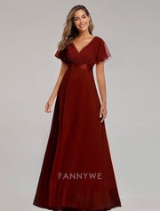 FannyWe Vestidos de fiesta sencillos de corte A, elegantes, para invitadas de boda, graduación, largo hasta el suelo, manga corta, escote en V, vestido de dama de honor de gasa, espalda en V con volantes fruncidos