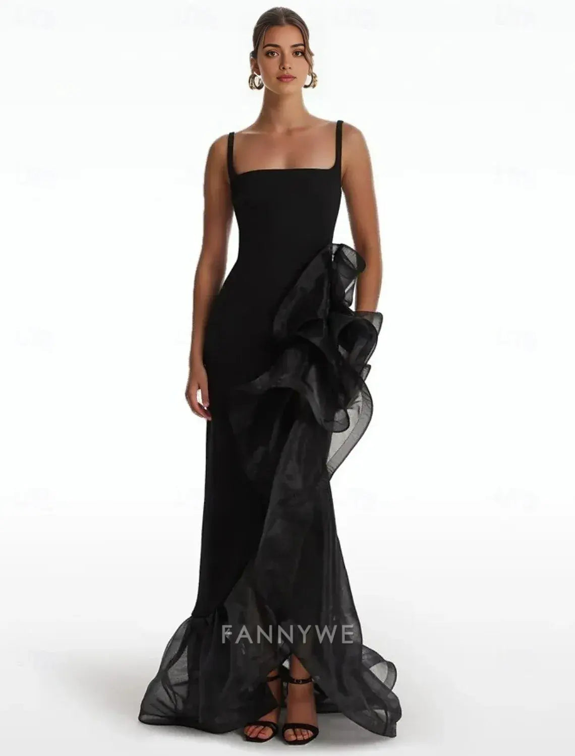 FannyWe Vestido negro sencillo de fiesta de corte A, elegante, formal, para boda, largo hasta el suelo, sin mangas, cuello cuadrado, satén con volantes, abertura en el hombro, flor