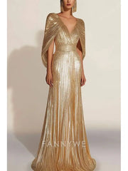 FannyWe - Vestido de noche elegante, sencillo, con lentejuelas doradas, corte A, para boda, formal, largo hasta el suelo, manga corta, cuello en V, capas, tela de lurex con pliegues - EE. UU. 2 / Reino Unido 6 / UE 32