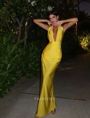 FannyWe - Vestido de fiesta sencillo de sirena/trompeta, color amarillo, de satén, para boda, para invitados de boda, largo hasta el suelo, sin mangas, cuello halter con detalles fruncidos