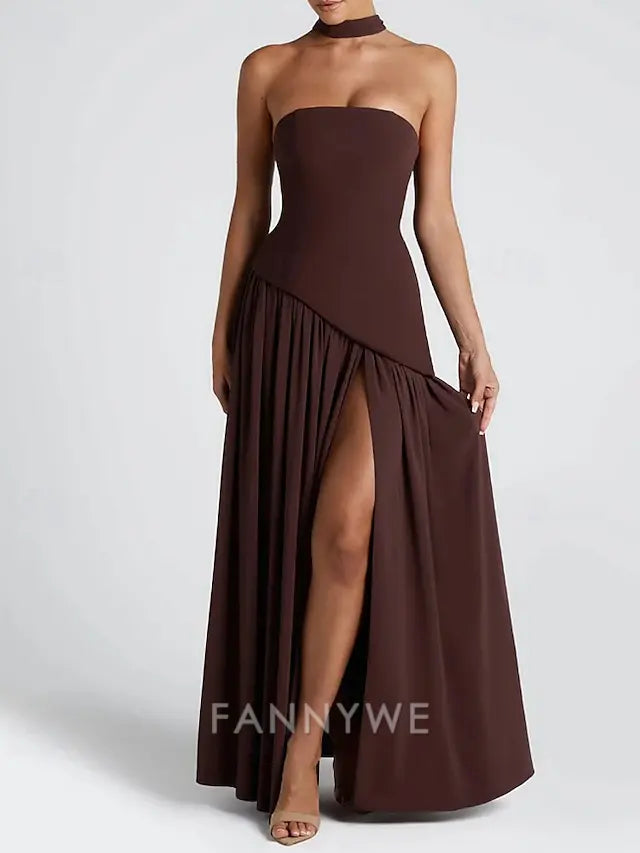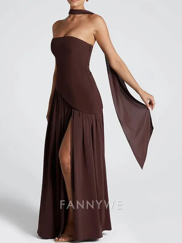 Este vestido es una impactante combinación de diseño moderno y elegancia. El corpiño asimétrico sin tirantes crea una silueta audaz, mientras que la falda fluida con abertura alta añade dramatismo y movimiento. Un fajín drapeado alrededor del cuello aporta un toque extra de sofisticación. Elaborado con atención al contraste y la estructura, equilibra un estilo vanguardista con un encanto atemporal. Perfecto para eventos de lujo o fiestas a la moda, este vestido marca una gran diferencia de estilo, garantizando que destaques con su corte único y sus detalles artísticos.