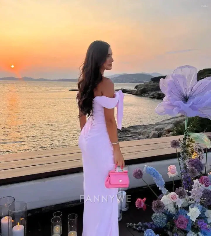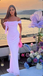 Vestido de noche elegante de sirena con hombros descubiertos y largo rosa para dama de honor