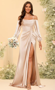 Vestido de noche formal de satén de manga larga con sirena y vestido de fiesta con limo - EE. UU. 2 / Reino Unido 6 / UE 32 / Champán