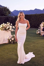 Elegante vestido de novia de satén con escote redondo y cola de sirena