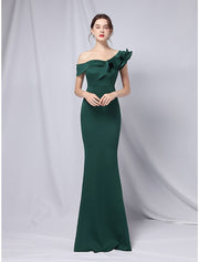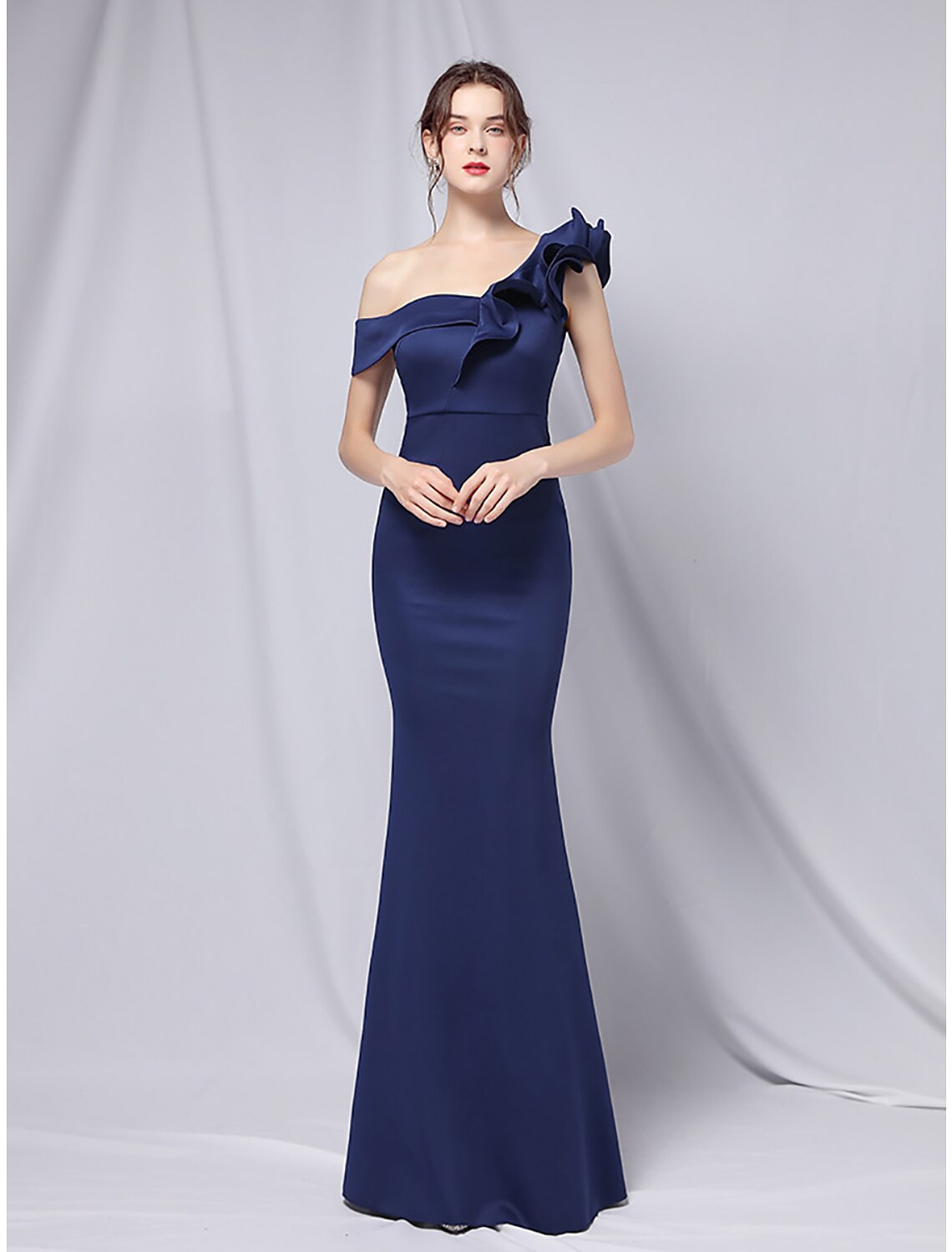 Vestido de noche estilo sirena/trompeta, estilo imperio, para invitada de boda, largo hasta el suelo, manga corta, un hombro, satén elástico con volantes