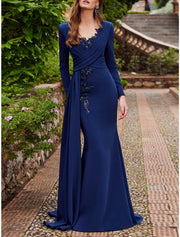 Vestido de sirena/trompeta para madre de la novia, elegante escote en V, cola larga, tejido elástico y fruncido con lentejuelas.