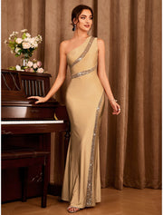 Vestidos de fiesta de sirena/trompeta, vestido sexy para boda, fiesta, largo hasta el suelo, sin mangas, un hombro, satén elástico con brillo