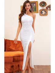 Vestidos de fiesta de sirena/trompeta, brillantes y con brillo, para bodas, hasta los tobillos, sin mangas, con un hombro al descubierto y lentejuelas con abertura.