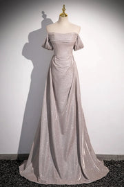 Vestido de noche largo con cola larga, mangas cortas y hombros descubiertos con volantes y lentejuelas