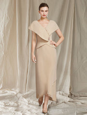 Vestido elegante para madre de la novia, de corte tubo/columna, escote en V alto y bajo, asimétrico, largo hasta los tobillos, de gasa, manga corta con volantes y broche de cristal.