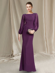 Vestido de madre de la novia con corte tubo/columna, elegante, escote joya, largo hasta el suelo, de gasa, manga larga con cuentas
