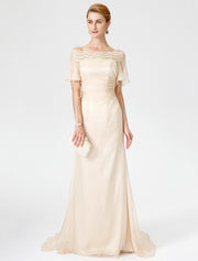 Vestido elegante para madre de la novia, con corte en forma de columna, hombros descubiertos, cola larga, encaje de gasa, manga corta y pliegues