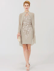 Vestido de madre de la novia con corte tubo/columna, formal, clásico y atemporal, elegante y lujoso, convertible, cuello ilusión, largo hasta la rodilla, gasa, encaje completo, manga larga con apliques