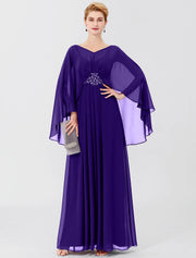Vestido de madre de la novia con corte tubo/columna, formal, clásico y atemporal, elegante y lujoso, elegante, escote en V, largo hasta el suelo, gasa, manga larga con pliegues y abalorios.